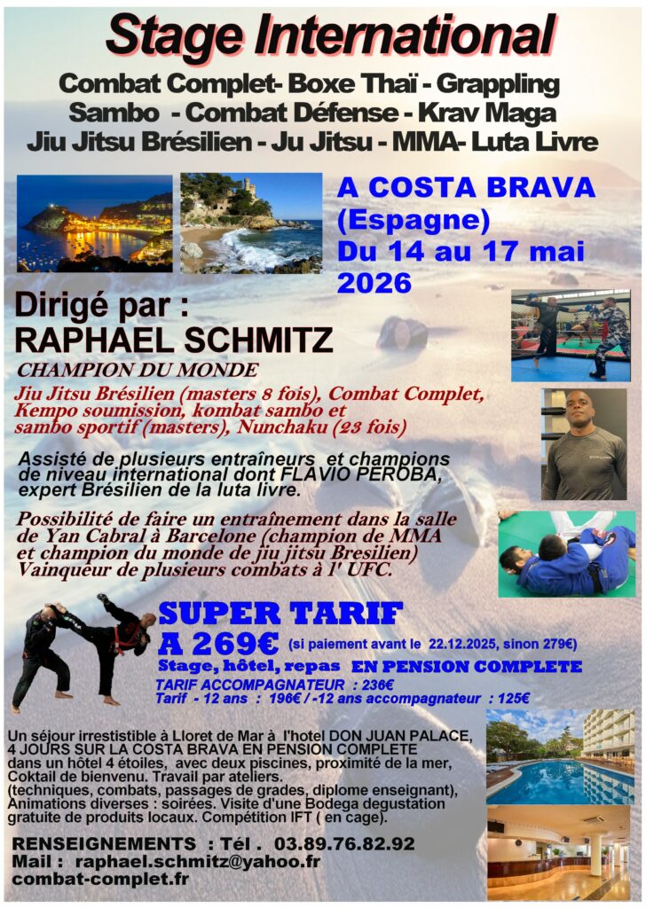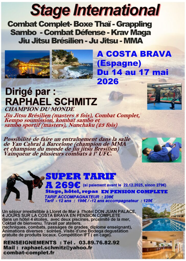 - Du 14 au 17 mai 2026 : Stage international boxe Thaï – jiu jitsu Brésilien – MMA – grappling … à Costa Brava ( Lloret de Mar en Espagne)